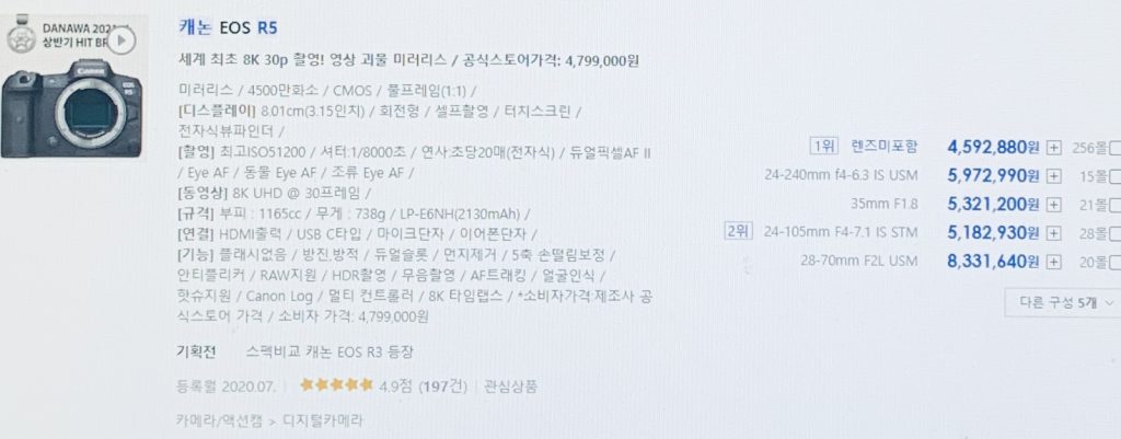 의외로 제일 많이 팔린건 캐논 eos r6, 역시 캐논은 캐논인가, 렌즈 가성비도 좋고, 본체 가격만 봤을때 제일 비싼건 캐논 r5, 당연히 스펙이 제일 좋으니깐 8K 30프레임 동영상 촬영도 되고.