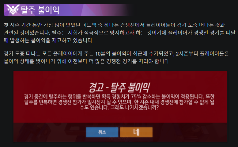 경쟁전은 랭크게임이고, 따라서 팀원이 도중에 탈주하더라도 아주 초반에 탈주하지 않는 이상은 경기가 취소되지 않고, 오버워치의 특성상 1명이라도 모자르면 99퍼센트 질 수 밖에 없기 때문에 그런 제약을 둔 것인데요, 탈주를 한 시즌에 여러번 하게 되면 아예 해당 시즌 2달여간 동안 경쟁전 경기를 참가할 수 없게 되기도 하는 등 그 불이익은 한 시즌 당 탈주 횟수에 따라 점차 커지게 하는 등 상당한 제약을 블리자드 측에서 가하고 있습니다.